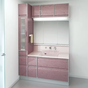 窯変ホーロー独特の色彩と美しい気品のあるフォルムが特徴。充実機能の洗面化粧台。