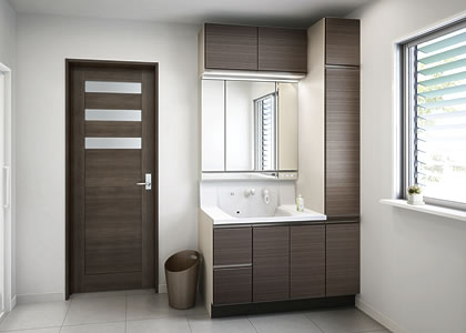 人工大理石カウンターと美しく調和する上品なデザイン。優れた収納力の木製洗面化粧台